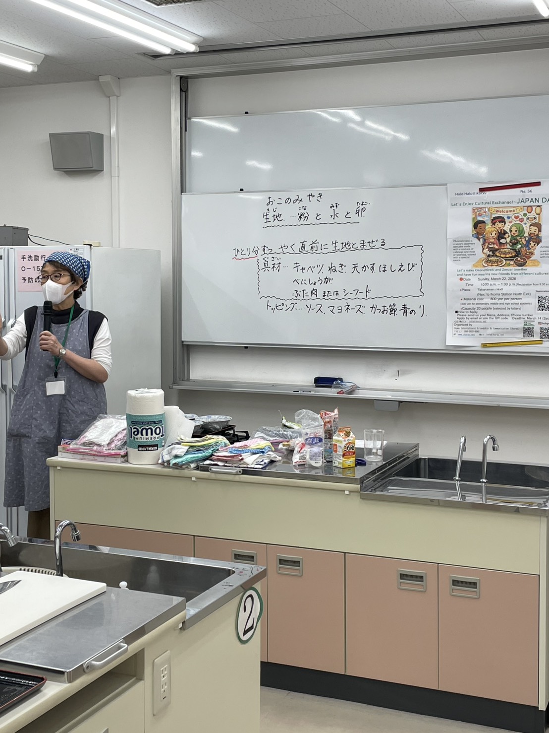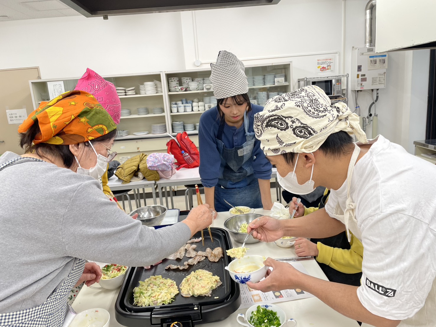 日本に来て間もない方、長く日本で生活されてきた方、国際交流に関心のある高校生、外国ルーツの子どもたちなど、ワイワイにぎやかにお好み焼きをつくり交流を深めました。グループごとに、個性あるお好み焼きが出来上がり、甘いぜんざいといっしょに美味しくいただきました。