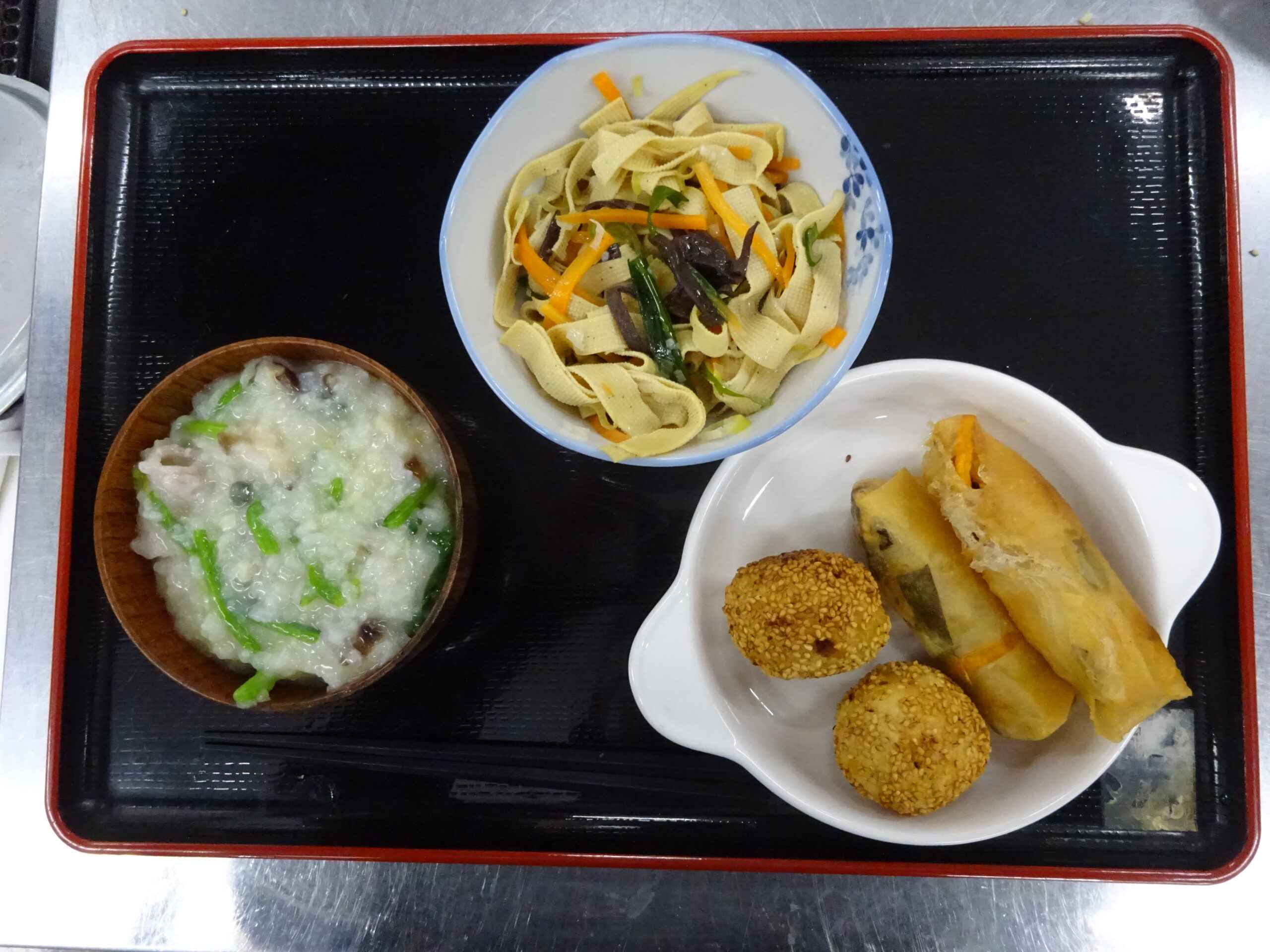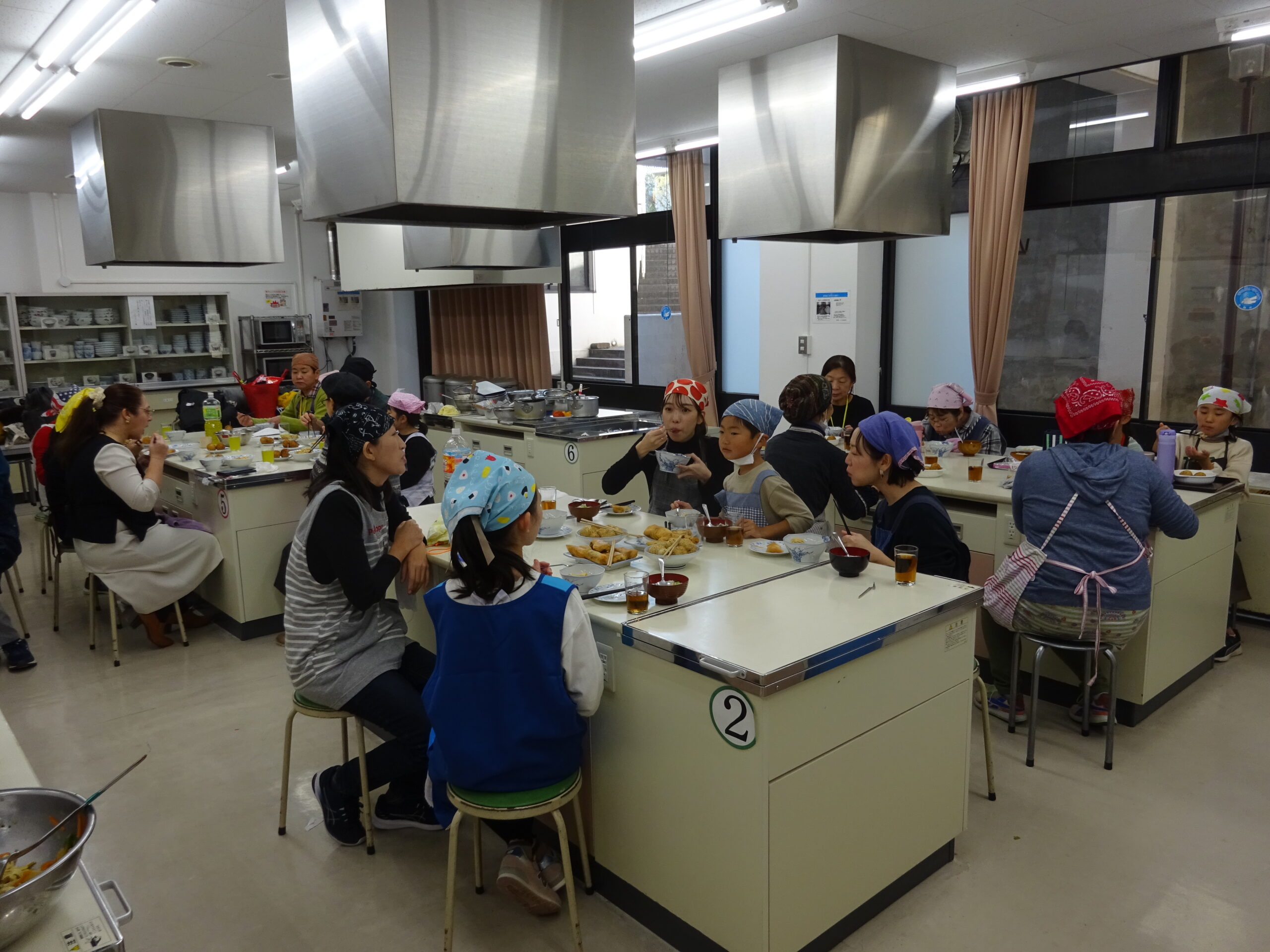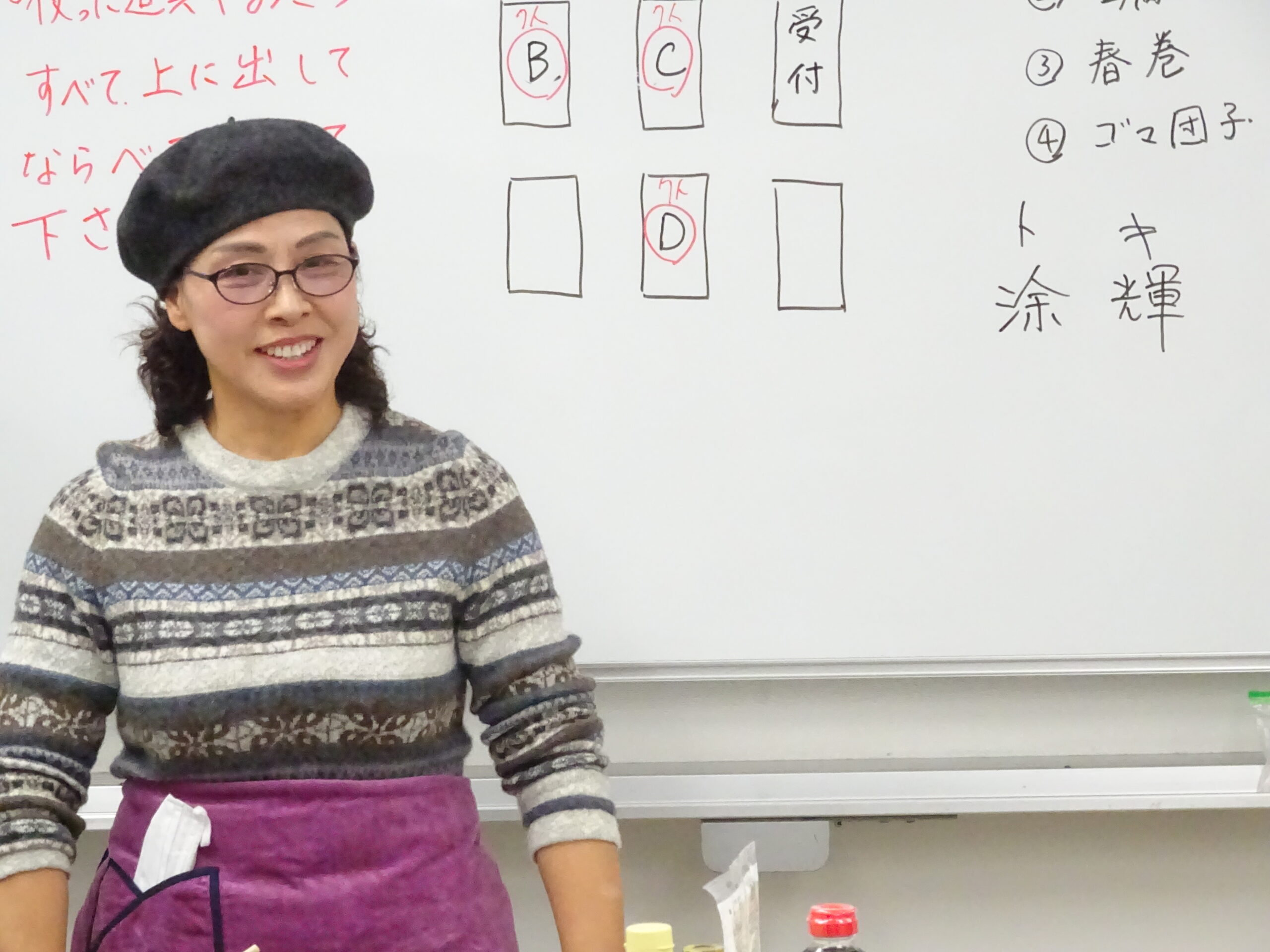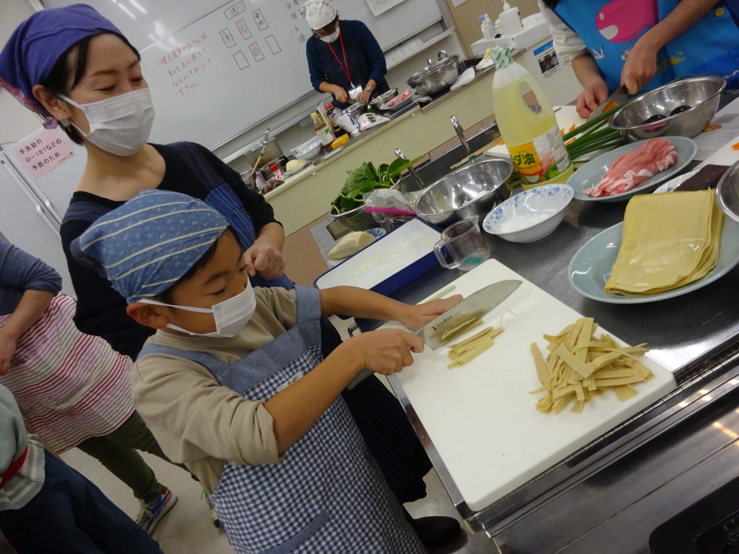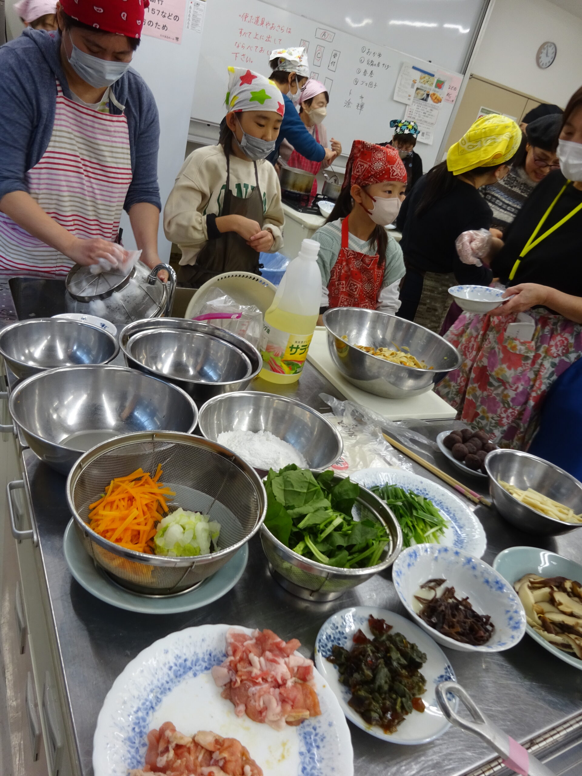 今回は、中国かゆ、春巻、豆腐皮のあえもの、ごま団子と料理の品数も多く、刻んだり、ゆでたり、揚げたりと、グループごとににぎやかに協力しながら、調理していただきました。