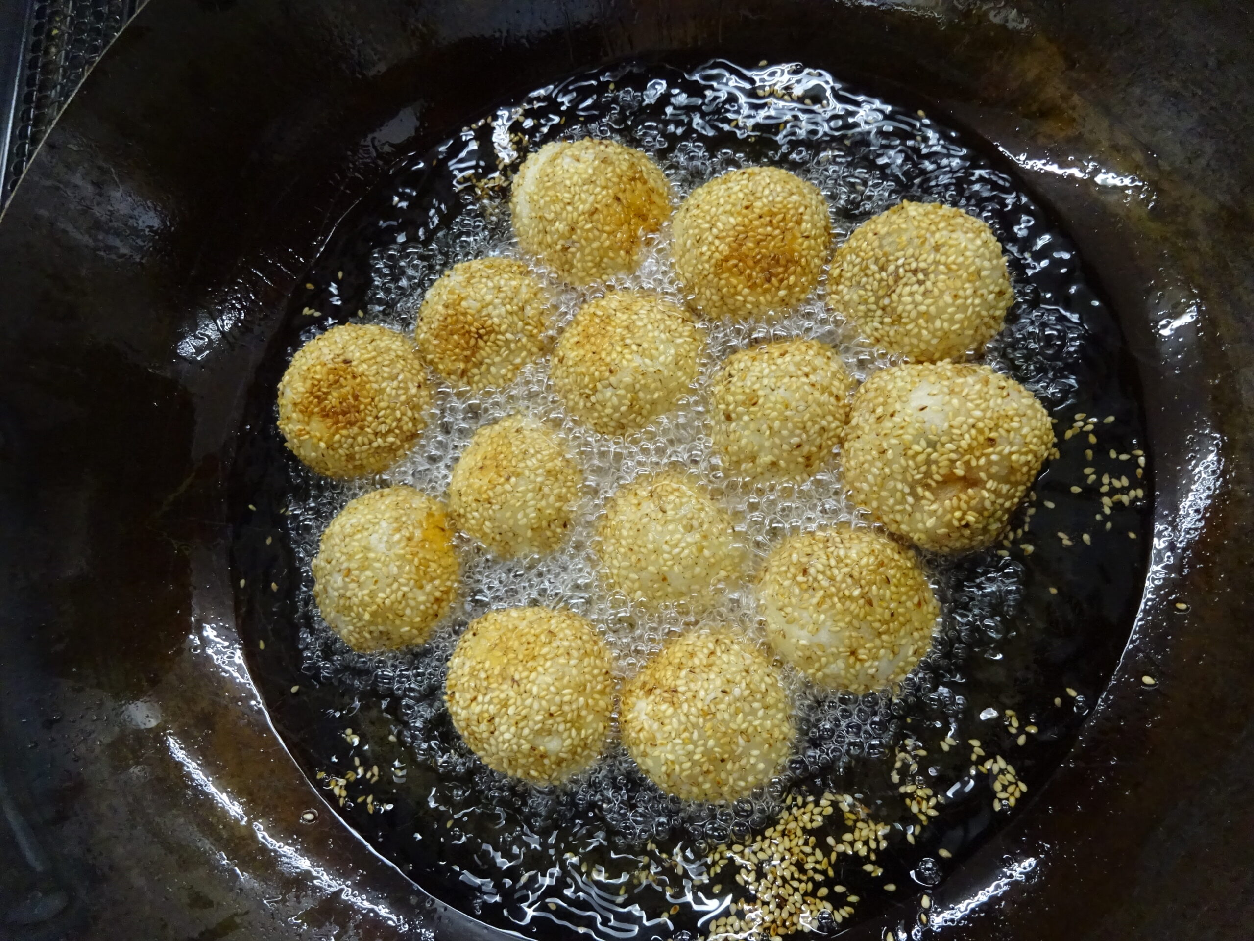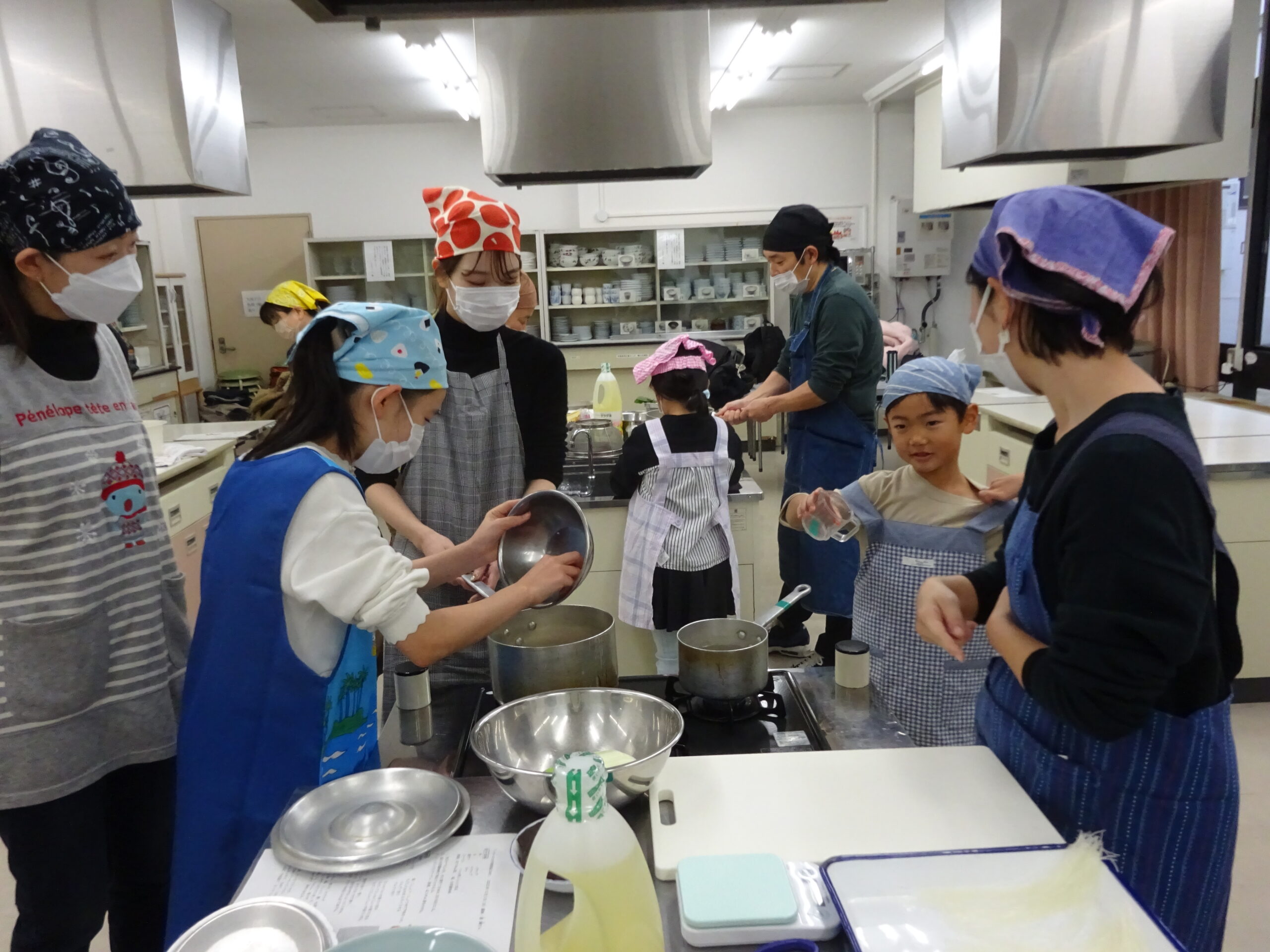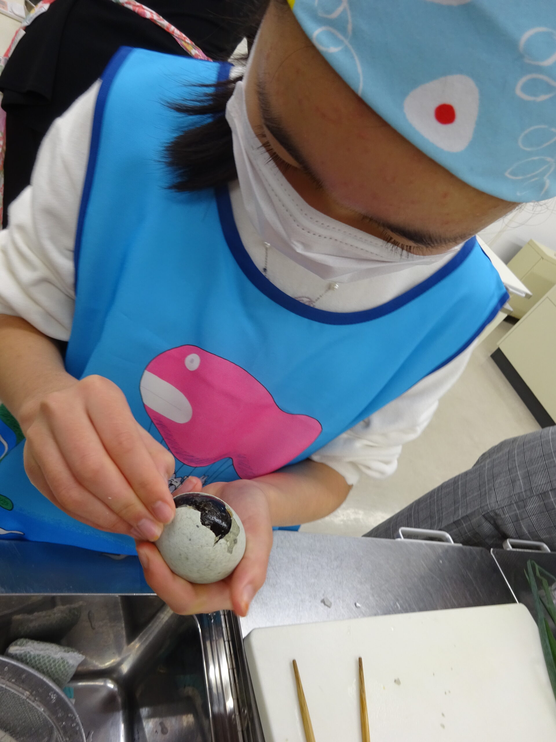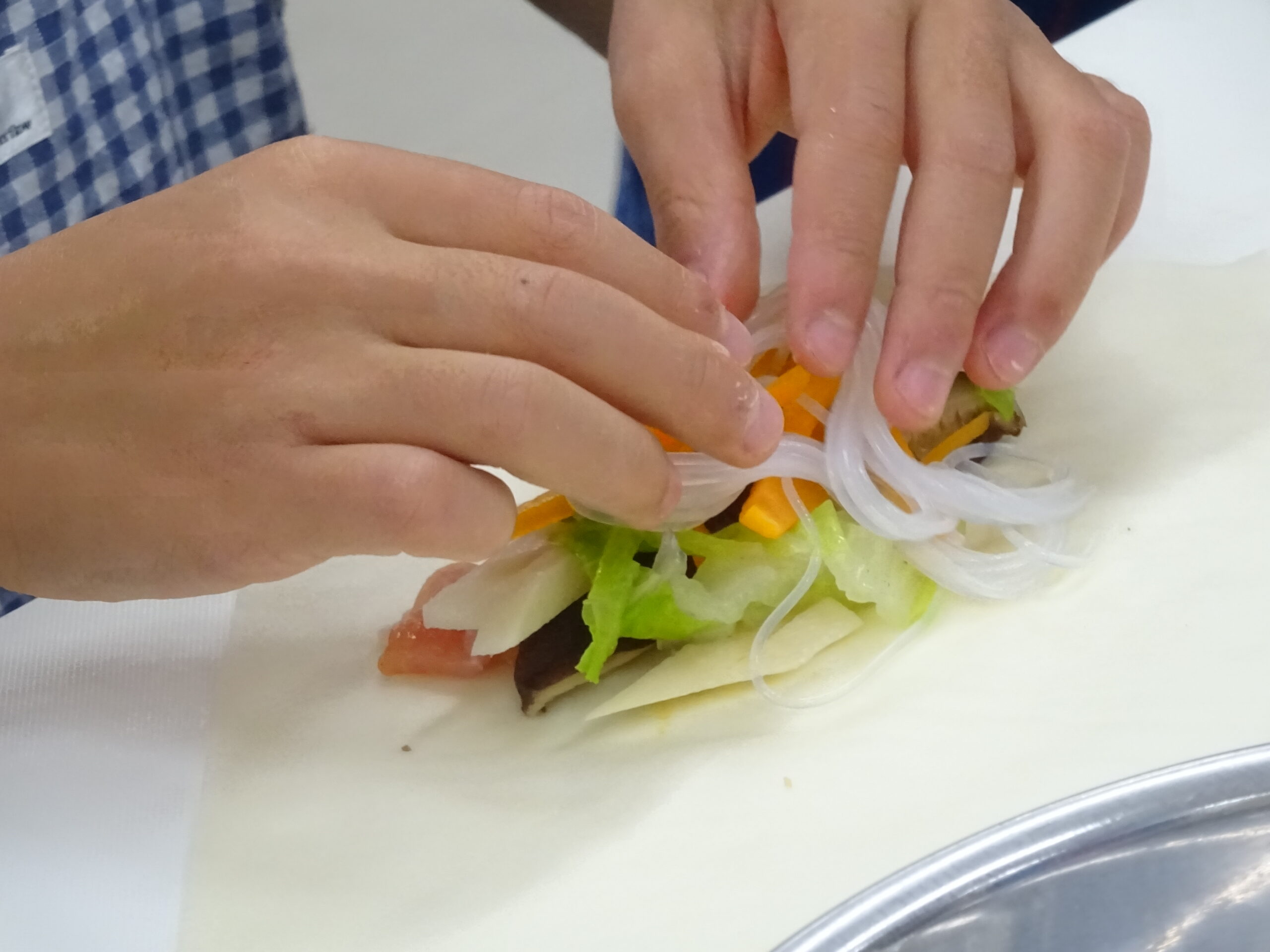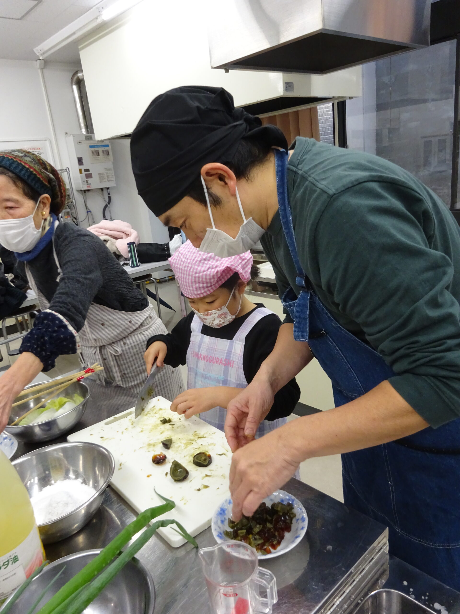 今回は、中国かゆ、春巻、豆腐皮のあえもの、ごま団子と料理の品数も多く、刻んだり、ゆでたり、揚げたりと、グループごとににぎやかに協力しながら、調理していただきました。