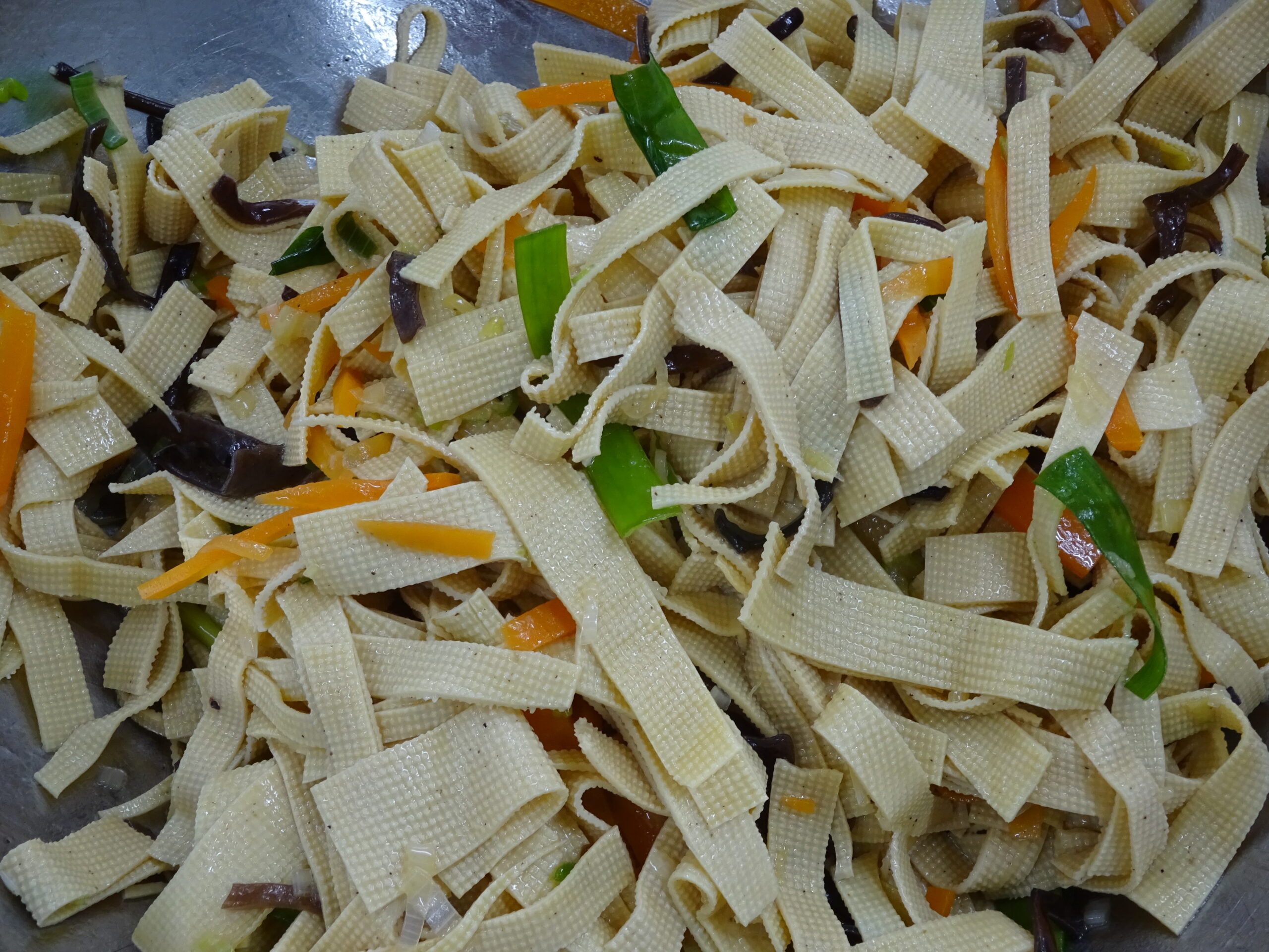 あえものに使われた豆腐皮は、「トウフーピー」といわれ、豆腐を薄く平らなシート状に伸ばした保存食です。たんぱく質などの栄養たっぷりな食材で、炒め物やサラダなどに使われるそうです。今回は冷凍したシート上のものを使いましたが、一見布のようで、どのような味や食感なのか、初めて見る方も多く、興味津々でした。実際食べてみると、高野豆腐を少し固くしたような食感で、確かに豆腐の味がしました。