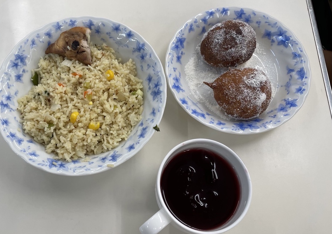 日本のお米とはまた違った変わった米のかたちや食感、珍しいスパイスの香りにびっくりする子どもたちも。できあがりは意外にマイルドで、食べやすいフライドライスでした。かわいいかたちの揚げドーナツのポフポフとパイナップルの香りただようハイビスカスティーもいただきながら、本格的なナイジェリアの家庭料理を楽しみました。